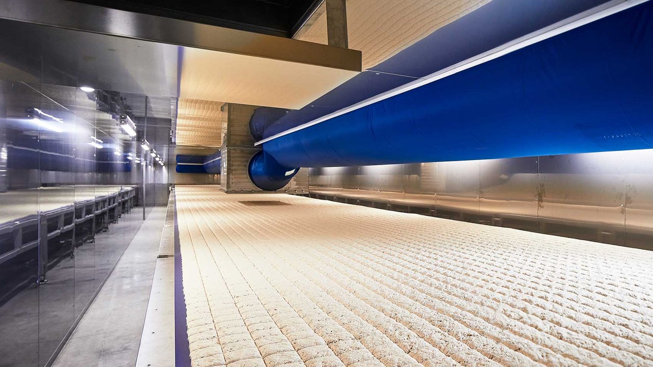Im Kneter entstehen mit 8,5 t/h große Teigmengen in wenigen Minuten. Ein neuartiges Knetverfahren sorgt für eine gleichmäßige Struktur. Ein Walzwerk formt daraus einen 3 m breiten Teigteppich, der rund 30 Minuten im Gärkanal verweilt und anschließend im 100 m langen Backprozess rezeptgesteuert gebacken wird.