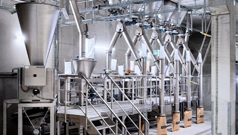 Die Paniermehlherstellung beginnt mit einer exakt gesteuerten Rohstoffzugabe. Mehl wird per LKW angeliefert, pneumatisch in sechs Silos gefördert und anschließend gemeinsam mit Salz, Paprika und weiteren Basisstoffen vollautomatisch dosiert. Da einige Produkte schwer austragbar sind, kommen erstmals Doppelwellendosierer DDMG zum Einsatz. Mit einem Förderstärkenbereich von 1:15 und einer Dosiergenauigkeit im Grammbereich sichern sie die Qualität des späteren Teigteppichs.