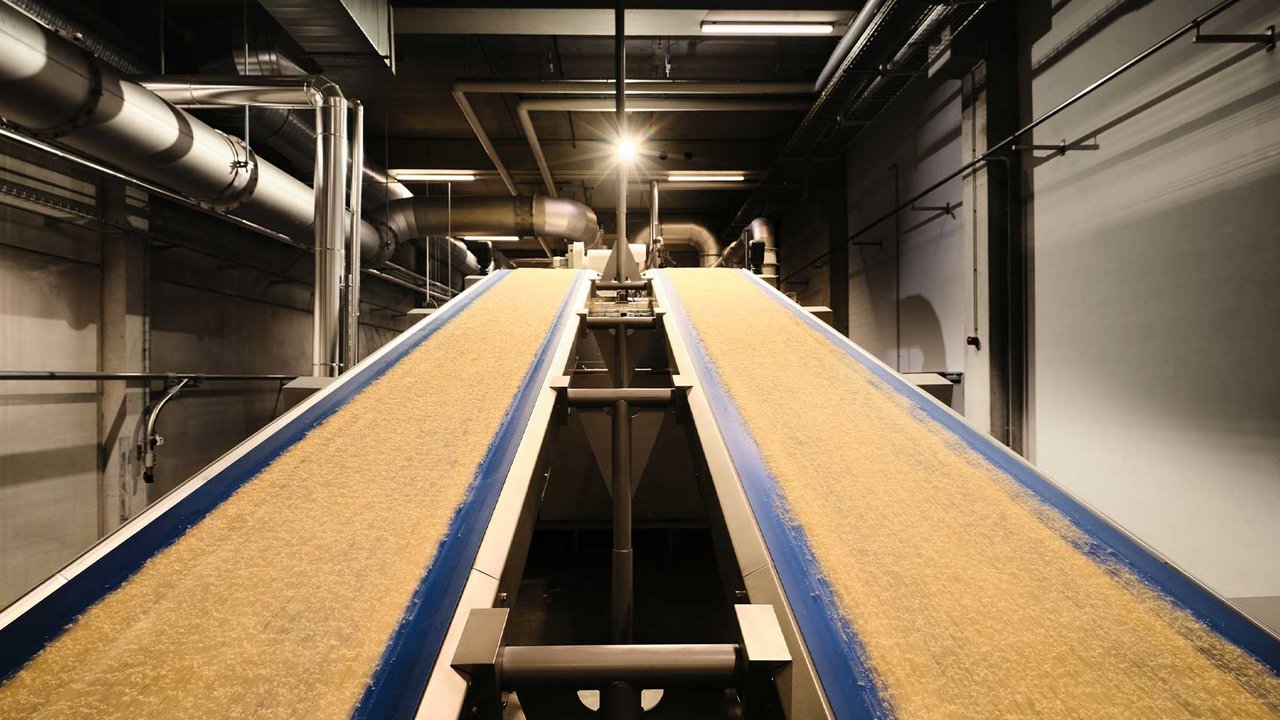 Das getrocknete Paniermehl wird in zwei Siebstufen in zehn Fraktionen sortiert. Bandwaagen mischen diese nach Kundenrezeptur. Walzenstühle erzeugen bei Bedarf kleinere Korngrößen, während nicht benötigte Partikel in einer Hammermühle zu feinem Mehl vermahlen und wieder in den Prozess eingebracht werden – nahezu ohne Verluste. Um die Struktur der Körnungen zu erhalten, wird produktschonend mit Pendelbecherwerken gefördert. Die Endprodukte werden in Säcken, Big-Bags oder Silo-LKWs abgefüllt; Magnete und Suchspulen überwachen den gesamten Prozess auf metallische Verunreinigungen.
